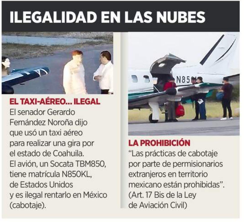El avión en cuestión tiene matrícula de Estados Unidos, lo cual le imposibilita legalmente para dar servicio de taxi aéreo, que fue el servicio que contrató Noroña para una gira por Coahuila, según él mismo reconoció.