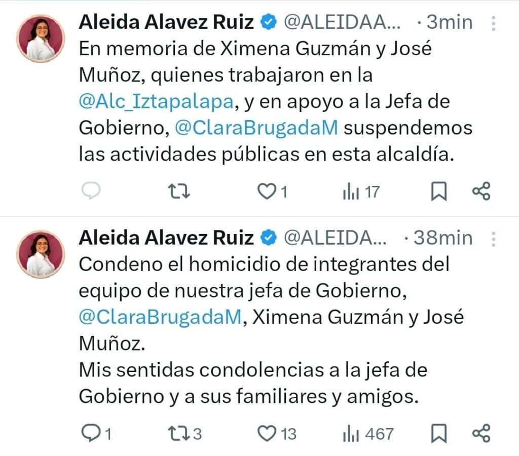 Los asesinatos de los funcionarios de la CDMX, Ximena Guzmán y José Muñoz han sido deplorados por numerosos personajes políticos, desde la presidenta Claudia Sheinbaum hasta la excandidata presidencial Xóchitl Gálvez, pasando por diputados, senadores, alcaldes, secretarios de Estado, funcionarios federales, líderes partidistas y más.
