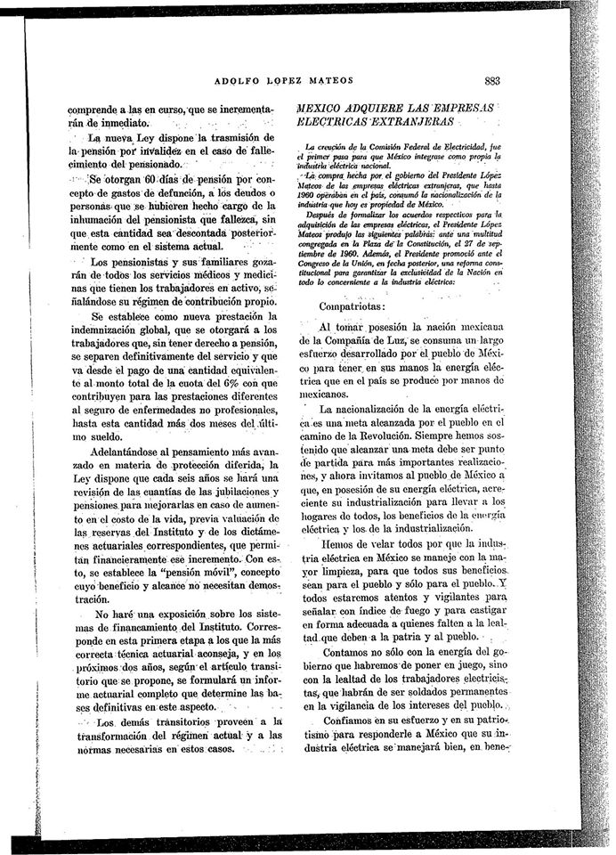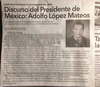 “El 27 de septiembre de 1960, al nacionalizar la industria eléctrica, después de referirse a la claridad de los preceptos en los artículos 27 y 28 constitucionales, esta fue la oratoria de López Mateos”