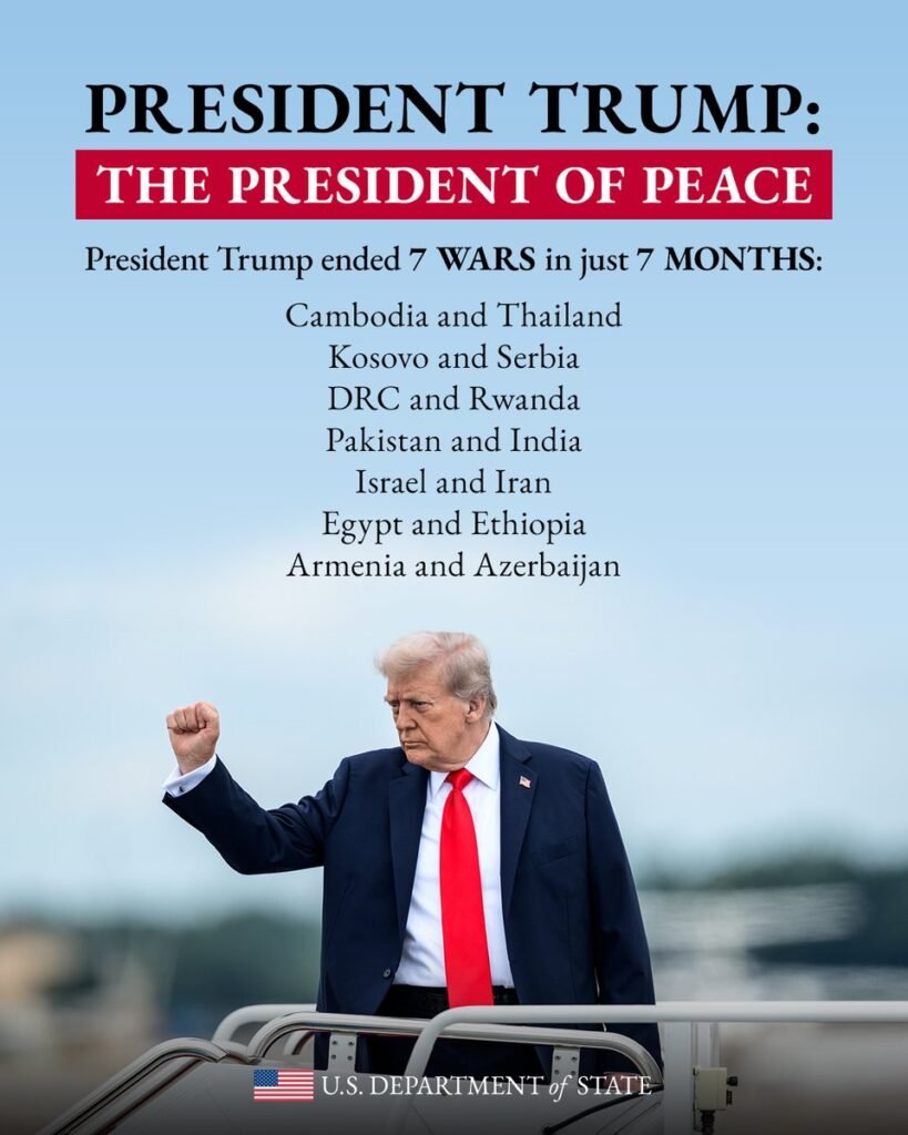 A propósito de encuentros y viajes, Trump ha decidido operar como mediador de cara a diversos conflictos internacionales, y lo mismo ha producido planes de paz, por ejemplo, entre Israel y Gaza, que ante conflictos como entre Ruanda y la República Democrática del Congo, Camboya y Tailandia, Armenia y Azerbaiyán, Kosovo y Serbia, Israel e Irán, Egipto y Etiopía, Pakistán e India, algunos más efímeros que otros, utilizando constantemente la presión de los aranceles para propiciar concesiones entre las partes en conflicto. Ha señalado que él es más eficiente que Naciones Unidas, si bien las paces que ha logrado gestionar parecen de corta duración que constituyen sobre todo eventos mediáticos. El Departamento de Estado se ha encargado de impulsar la imagen de Trump como la del “presidente de la paz” y abiertamente el casi octogenario personaje ha dejado entrever su interés en torno al Premio Nobel de la Paz -aun cuando la galardonada con esa distinción en 2025, la opositora venezolana Corina Machado, regaló su premio al presidente estadunidense en un hecho que ha motivado una avalancha de memes.