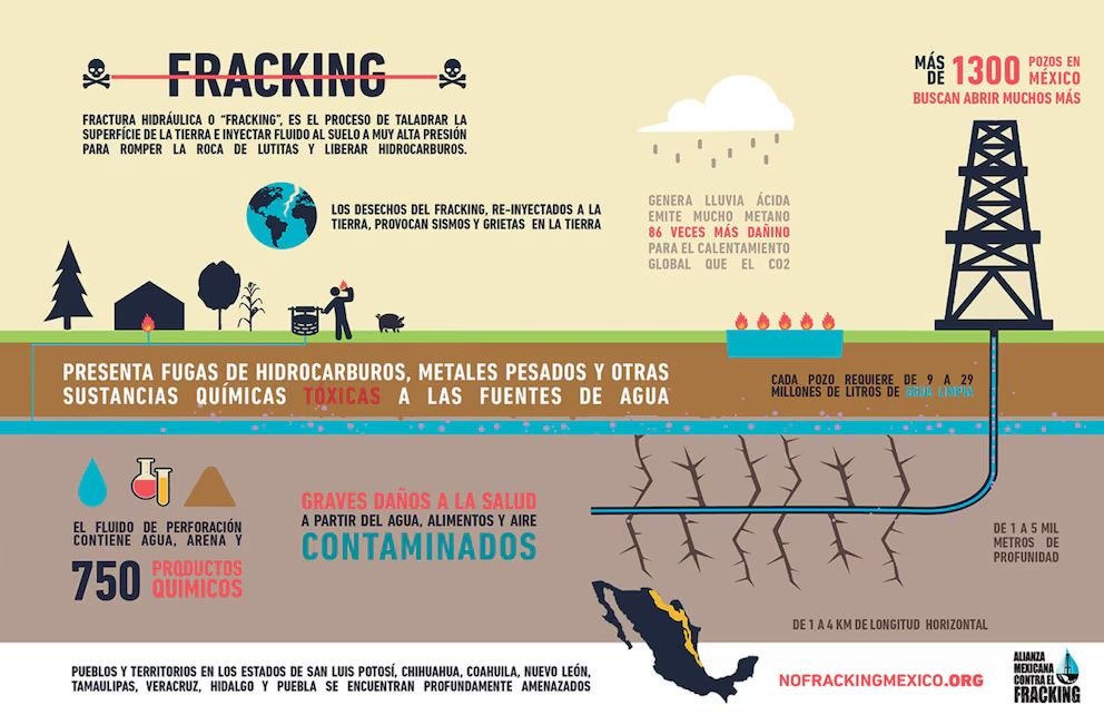 El fracking emplea grandes cantidades de agua: el Fondo Mundial para la Naturaleza (WWF) comenta que para un solo pozo perforado se pueden requerir entre 9 mil y 29 mil metros cúbicos de agua. Para dar una idea al lector de a cuánto corresponde esta cantidad de agua, sería el equivalente entre 2. 4 y 7. 7 piscinas olímpicas. Lo más grave es que no se perfora sólo un pozo. El procedimiento se realiza con seis o más pozos. Si fuesen sólo seis, la cantidad de agua requerida sería de 54 mil a 179 mil metros cúbicos. Para un país con los peligrosos niveles de estrés hídrico existentes como México, no parece una buena idea emplear el agua para la extracción de hidrocarburos a grandes profundidades, esto porque además el proceso involucra la mezcla del agua con arenas y químicos para evitar que las perforaciones realizadas a las duras rocas se vuelvan a cerrar. Como el uso de agua es intensivo continuamente por períodos, generalmente, de dos semanas, las comunidades aledañas al lugar en que se haría la fracturación hidráulica podrían verse privadas del acceso al vital líquido y se ha visto que este ha sido el caso en regiones donde se desarrollan actividades agrícolas y forestales. El fracking también puede coadyuvar a la deforestación, debido a la necesidad de instalar infraestructura en espacios amplios para llevar a cabo la fractura y extracción. Un problema adicional es la contaminación del fracking que podría afectar a los mantos freáticos, sin contar que el proceso en sí también podría liberar metano, que es uno de los gases responsables de generar el efecto de invernadero.