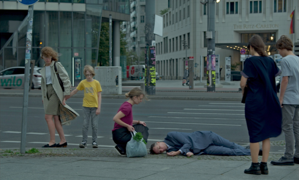 La cinta sigue la vida de un hombre, desde su juventud despreocupada hasta su madurez. En el proceso, salta geografías, pasando al menos por Grecia y Alemania. El cuidado de Schanelec está en la construcción del flujo audiovisual, no en forzar verosimilitud, aunque se trate de una cinta realista. La falta de teléfonos celulares permite adivinar que la mayor parte de la historia es previa al siglo XXI. Hay indicadores del paso del tiempo, como el desarrollo de la hija de los protagonistas, pero no hay angustia que lleve a fingir el envejecimiento en los rostros o el pelo de ellos, recurso fácil del cine convencional. La estrategia de la directora no es naturalista: los artificios son constantes, como lo muestran el contraste de color entre sábanas blancas y el oscuro atuendo de una joven celadora o que ese personaje repose después en lo más alto de una columna de colchones. Un accidente lleva al protagonista a la cárcel y esa celadora se ocupa de él más allá de su deber, buscando ungüento en alguna farmacia para los lastimados tobillos del cautivo. De esta forma, más allá de la verosimilitud —valor menor— Schanelec se ocupa de cómo el amor, o al menos los emparejamientos, suceden todo el tiempo, en cualquier parte.