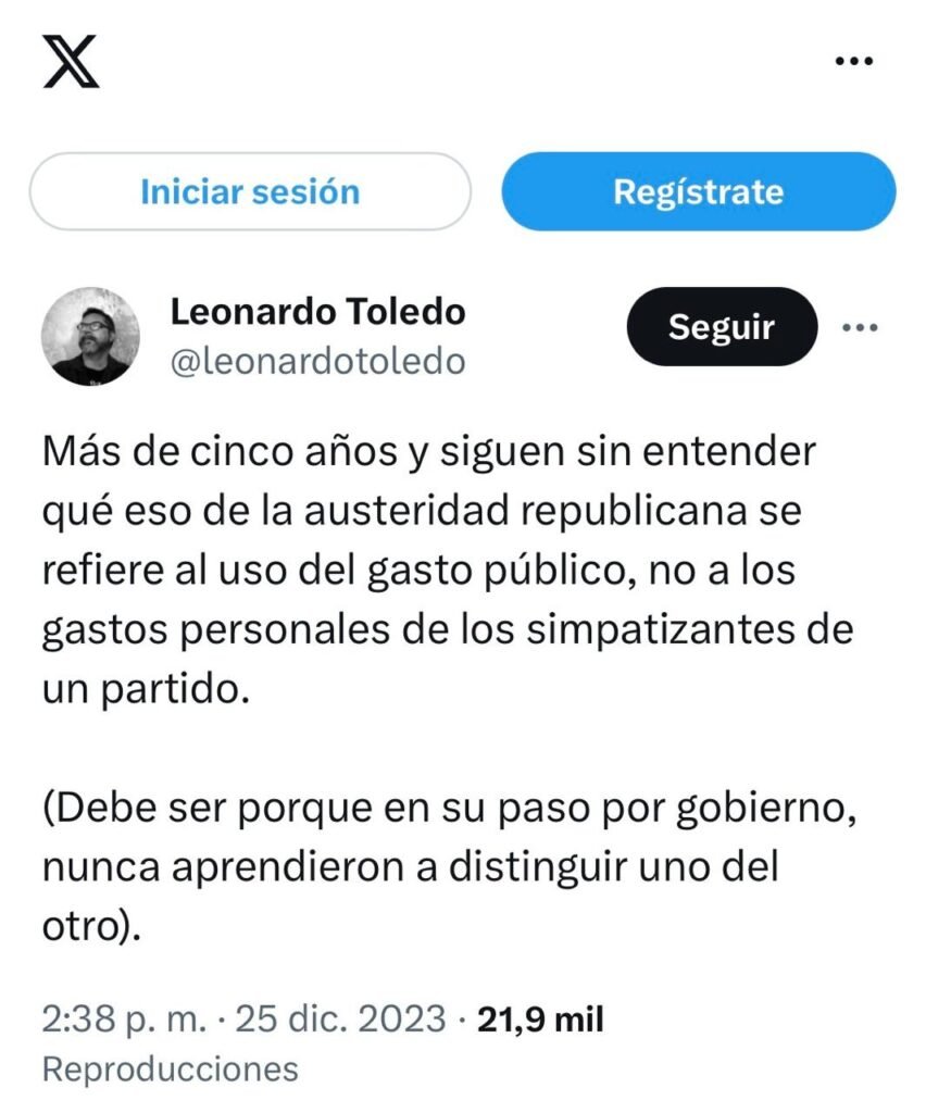 Ésa es la línea de Noroña, y también por eso digo que ya no es de izquierda, si lo fue. Esa austeridad sí la cumplen los gobiernos obradoristas, y es la que no deberían cumplir, si fueran lo que dicen ser. Pero como no lo son, tienen que decir lo que dicen. Lo de Noroña y Toledo. Ésa es la línea de los “intelectuales” obradogobiernistas porque Noroña no es una excepción sino un caso más dentro de la hacienda amloísta. Con otras palabras: como en un nivel de sus élites internas el obradorismo es un sistema informal de enriquecimiento privado a partir del Estado y contra el Estado en su versión democrática, los “analistas simpatizantes” (propagandistas) tenían que darles cobertura a sus líderes, es decir, a esas élites corruptas; tenían que ensancharles la salida, la ruta de escape ideológico-retórico. De ahí tuits como el de Toledo, Toledito. Pero ya se ve, también ellos son corruptos, imbéciles o las dos cosas… Algunos aceptan intercambiar su lengua mordida y molida por algún beneficio material, otros ya ni siquiera se dan cuenta de lo que dicen ni qué implican.