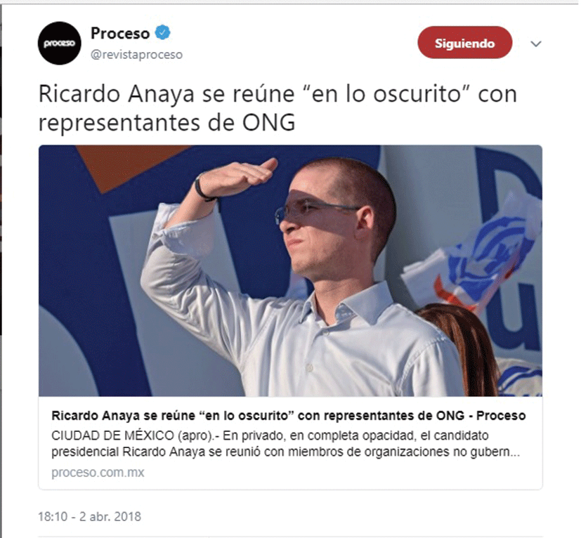 El pasado 2 de abril, el reportero del semanario Proceso, Álvaro Delgado, publicó una nota en la que afirmó que el candidato presidencial de la coalición Por México al Frente, Ricardo Anaya, se reunió “en lo oscurito” con organizaciones de la sociedad civil como Causa en Común, Mexicanos contra la Corrupción y la Impunidad, México Unido contra la Delincuencia y Transparencia Mexicana, entre otras. Y a través de un mensaje en su cuenta de Twitter, refuerza la idea de que la reunión fue “secreta”.