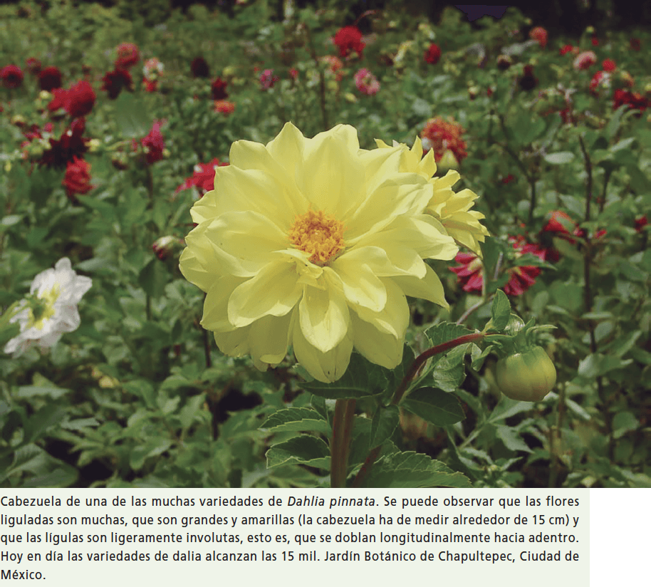Las dalias son herbáceas que se distribuyen desde México hasta Colombia –según los botánicos Graciela Calderón y Jerzy Rzedowski–. Pertenecen a la familia Asteraceae caracterizada por desarrollar inflorescencias (grupos de flores) en estructuras llamadas cabezuelas o capítulos que simulan ser una gran flor pero que en realidad está formada por dos tipos de flores que se insertan en un receptáculo: las que se encuentran en el perímetro suelen tener una larga y colorida lígula –que simula pétalos– y las flores tubulares que están en el disco del receptáculo. Las dalias son angiospermas criptófitas pues poseen tubérculos o raíces tuberosas subterráneas con las que pueden soportar la sequía para luego, con las lluvias, desarrollar tallo, crecer y florecer.
