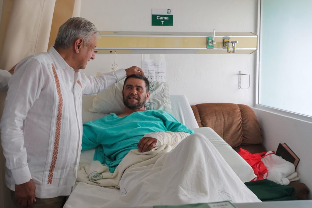 De esa ocasión queda una fotografía en la que se ve a López Obrador mientras acaricia la cabeza de un paciente chimuelo, encamado, con el brazo vendado.